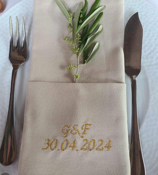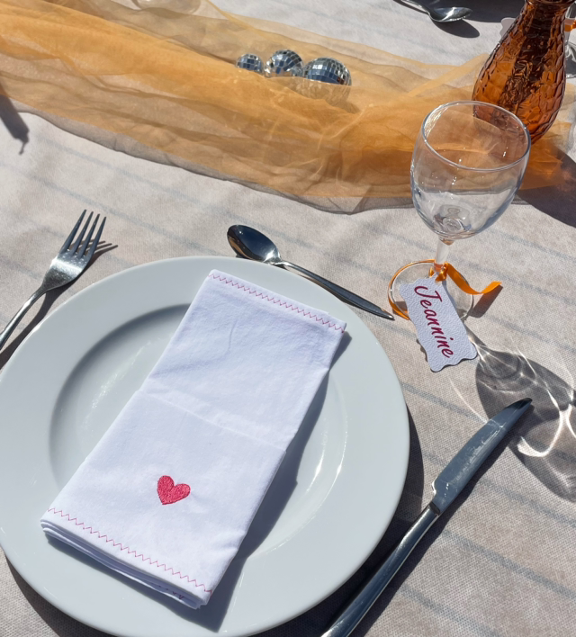 Confectionnée en coton blanc (45 × 45 cm), chaque serviette devient une pièce personnalisée selon vos envies : choix de la couleur de broderie, mot, phrase ou motif, ainsi que l’emplacement.